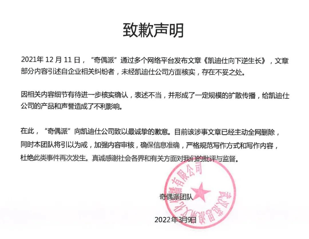 就不实报道对我司产品、声誉造成的严重影响和侵害,目前“奇偶派”团队已经主动删除全网不实文章,并进行公开书面道歉,该道歉公告近期也将正式刊登于《人民法院报》。