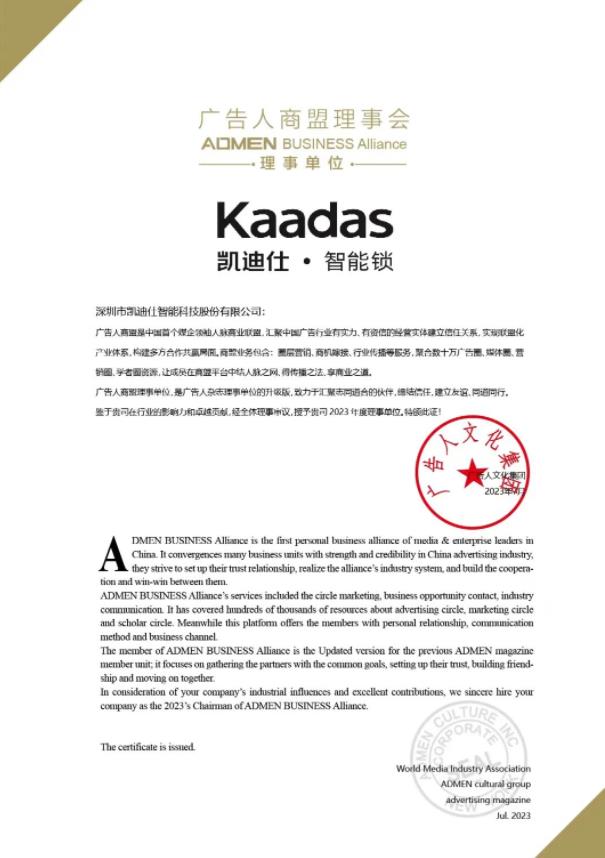 盛会首日,Kaadas伟德app安卓版下载被授予“2023年度广告人商盟理事会理事单位”荣誉称号、Kaadas伟德app安卓版下载“一眼锁定你”案例获得2023年度“第十二届ADMEN国际大奖·整合营销类实战金案”、Kaadas伟德app安卓版下载集团董事长苏祺云先生获得“2023当代中国品牌杰出青年才俊”大奖。伟德app安卓版下载一举包揽三大重磅荣誉,涵盖企业、案例、人物三大板块,综合实力再获多方认可。