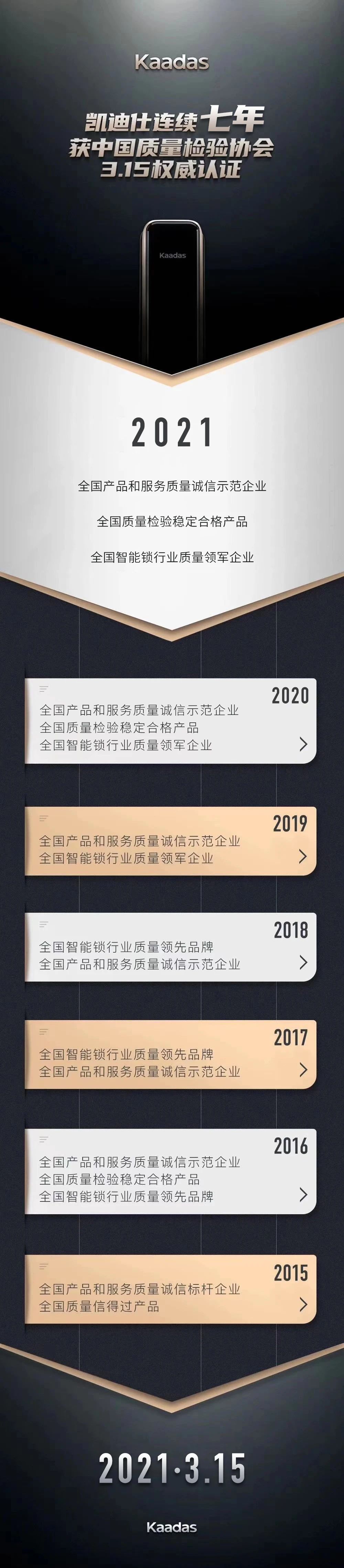 Kaadas伟德app安卓版下载连续七年,获中国质量检验协会3.15权威认证!