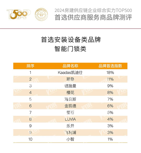 伟德app安卓版下载以18%的品牌首选指数稳居智能门锁行业第一名,远超第二名,同时,伟德app安卓版下载被收录入2024年中国房地产业协会供应链大数据中心5A供应商企业库(5A,即生产力、产品力、服务力、交付力、创新力)。