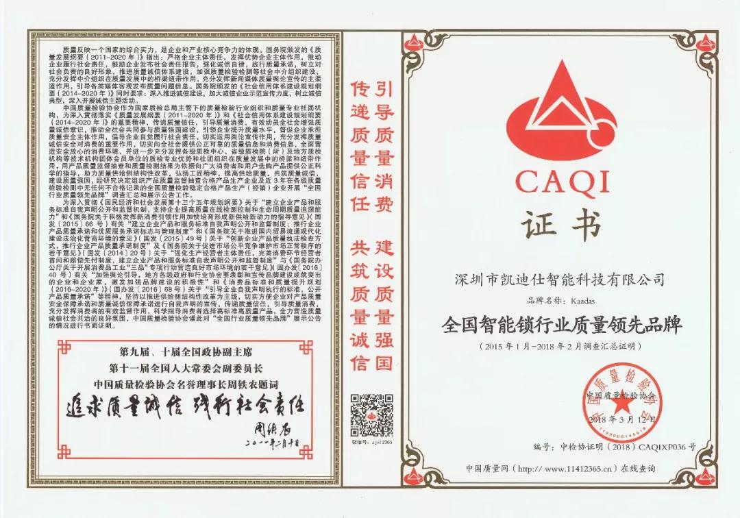 2018年3月15日,伟德app安卓版下载再获由中国质量检验协会颁发的“全国智能锁行业质量领先品牌”和“全国产品和服务质量诚信示范企业”两项大奖。至此,伟德app安卓版下载已连续四年获得这两项殊荣。