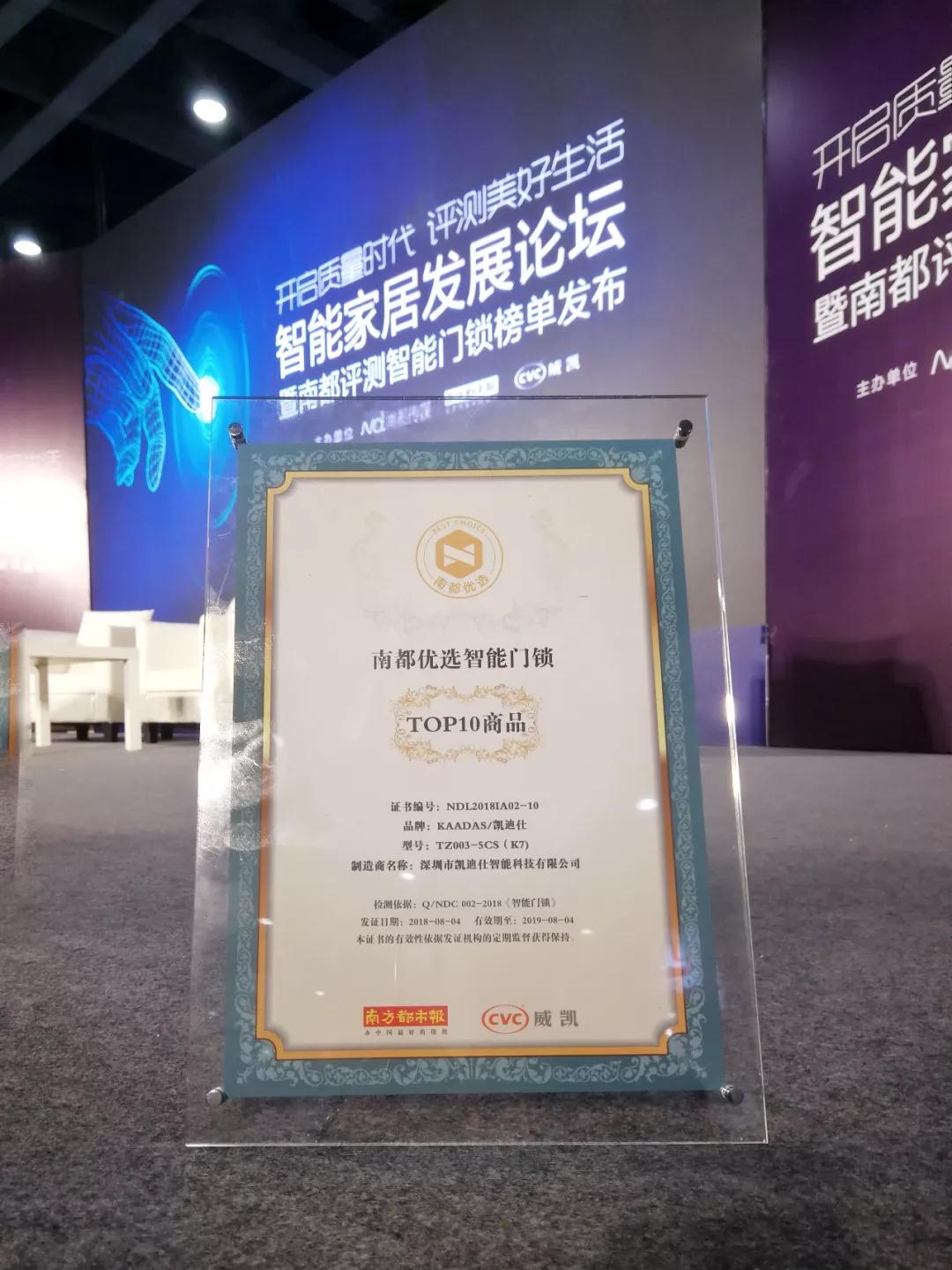 2018年8月4日,由南方都市报主办的“互联网+智能家居发展论坛暨南都评测智能门锁榜单发布会”于广州举行。Kaadas伟德app安卓版下载荣登南都智能门锁十大优品排行榜,并荣膺“南都优选产品”称号。