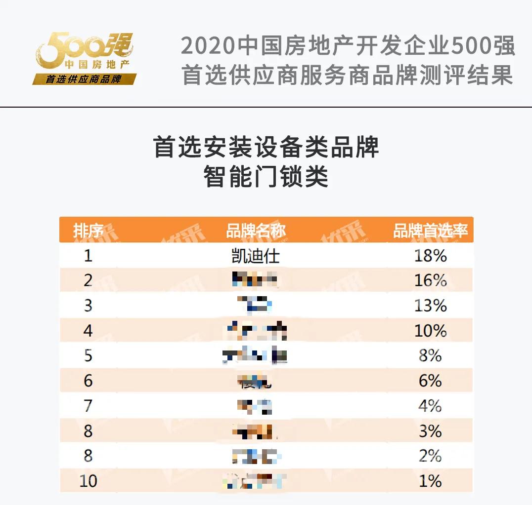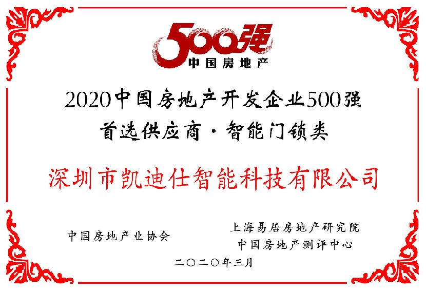 2020年3月18日,以“重塑-远见-启程”为主题的2020中国房地产500强测评成果发布会暨500强高峰论坛于线上如期举办,Kaadas伟德app安卓版下载位居智能门锁类目榜单榜首,荣获“2020中国房地产开发企业500强首选供应商”殊荣。自2017年新增智能门锁测评类目至今,伟德app安卓版下载已连续四年获得此项荣誉。