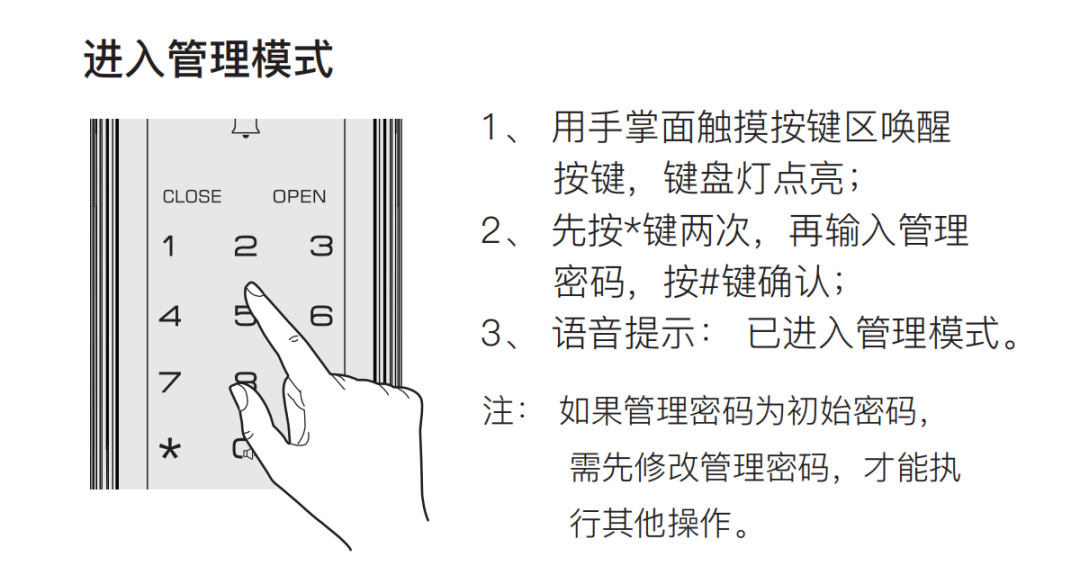 ② 先按**键并输入管理密码,按#键确认,支持管理指纹的,可按**键再按管理指纹,进入管理模式;
