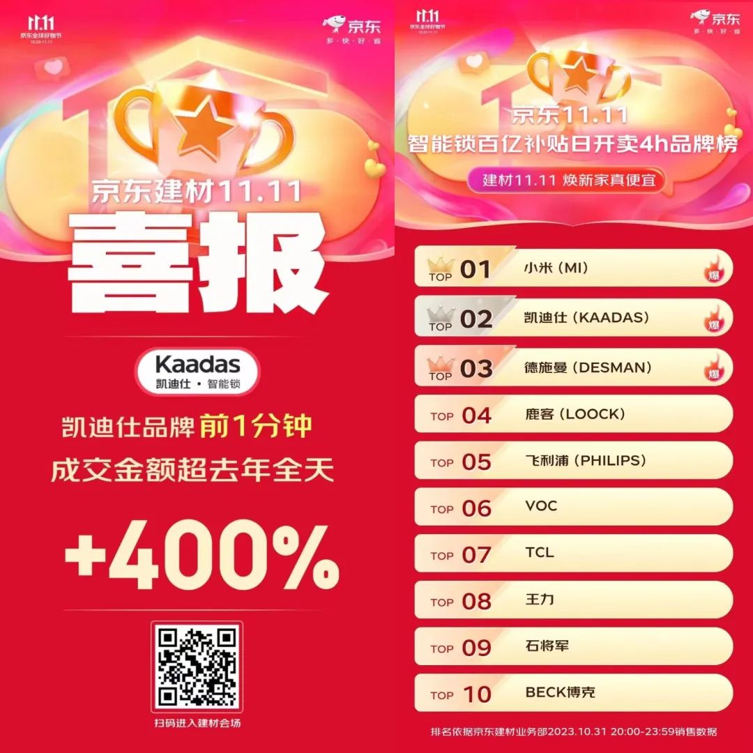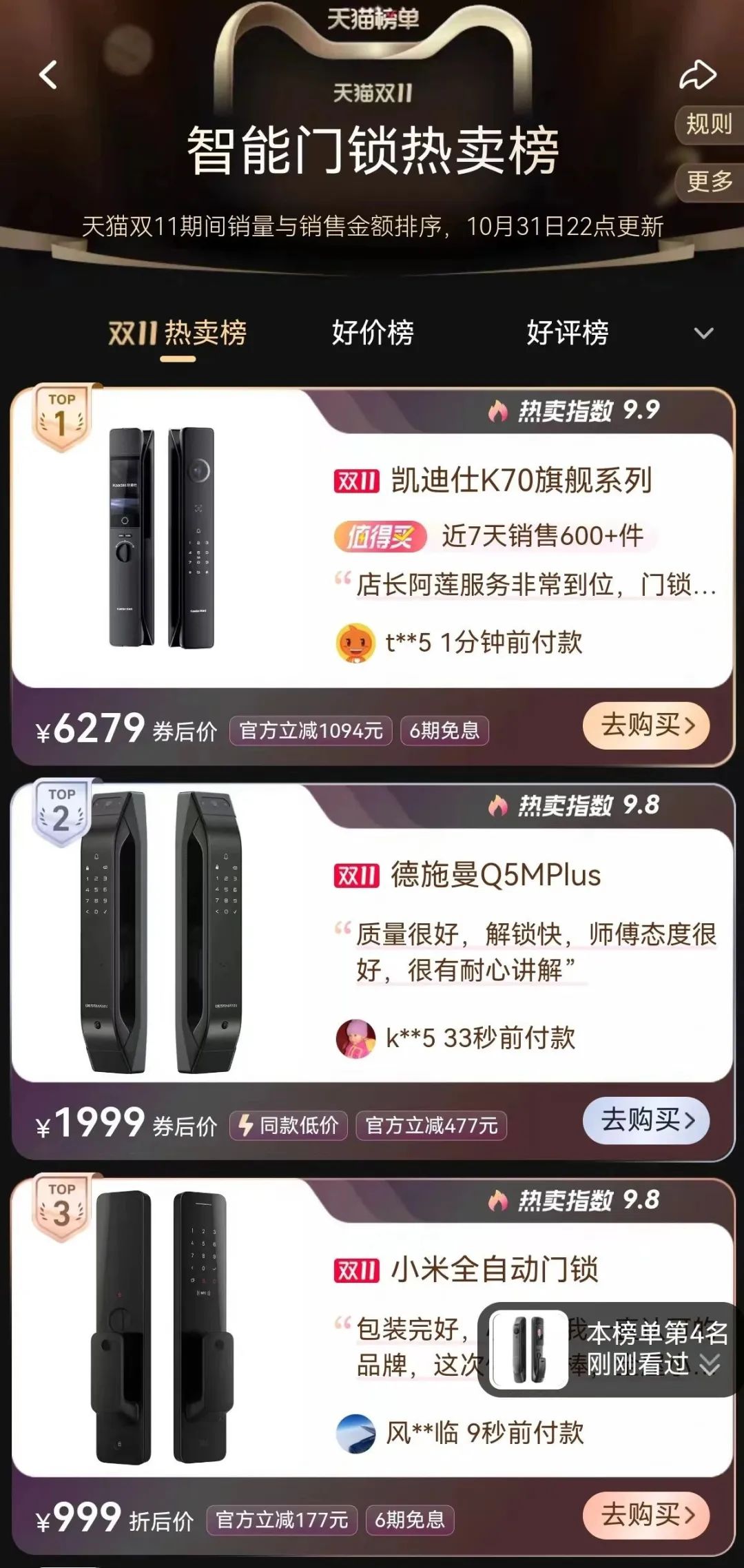 京东平台表现同样亮眼,伟德app安卓版下载品牌前1分钟成交金额超去年全天,同比增长400%,还获得京东11.11智能锁百亿补贴日开卖4h品牌榜TOP2。